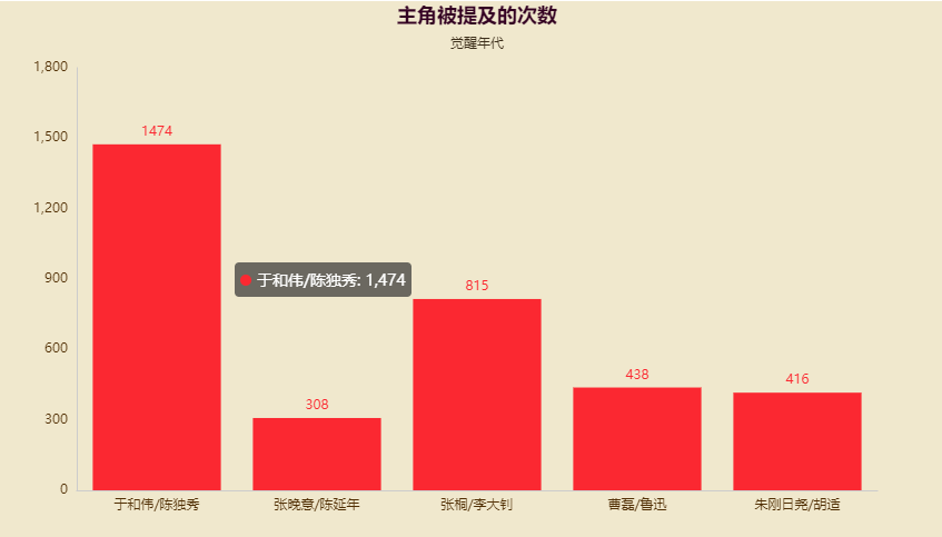 下面我们来绘制一下剧中的主角被提及的次数,当然可能有一些读者朋友不是特别熟悉该部剧,该剧的历史背景是1915年到1921年这段期间,由李大钊、陈独秀以及胡适领导的新文化运动开始讲起,从可视化出来的结果可以发现于和伟(皇叔)被提及的次数是最多的,哈哈哈