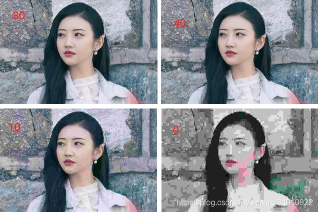 img_path = r"E:\img.jpg" img = cv2.imread(img_path) cv2.imwrite(r"E:\ret_80.jpg", img, [cv2.IMWRITE_JPEG_QUALITY, 80]) cv2.imwrite(r"E:\ret_40.jpg", img, [cv2.IMWRITE_JPEG_QUALITY, 40]) cv2.imwrite(r"E:\ret_10.jpg", img, [cv2.IMWRITE_JPEG_QUALITY, 10]) cv2.imwrite(r"E:\ret_0.jpg", img, [cv2.IMWRITE_JPEG_QUALITY, 0])