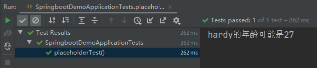 可以看到,测试方法placeholderTest()成功打印出了description属性的注入内容(age的取值始终在[20,30]之间随机显示),该内容与配置文件中配置的属性值保持一致。