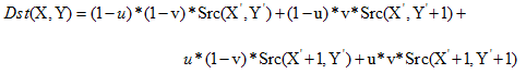 2、双线性:由相邻的四像素(2*2)计算得出,公式,