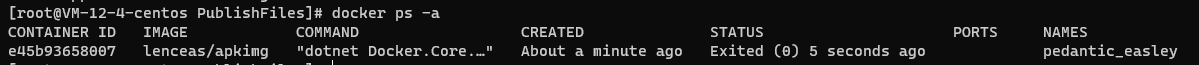 这时候可以看到多了一个容器ID为e45b93658007,镜像是lenceas/apkimg的容器,不过我们的项目容器是退出状态,需要开启下: