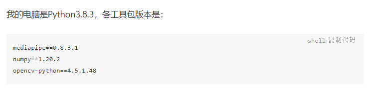 电脑需要安装Python3,建议安装Python3.8.x的版本。除此之外,还需要安装Opencv-Python、MediaPipe以及numpy几个工具包,可以使用pip进行安装:
