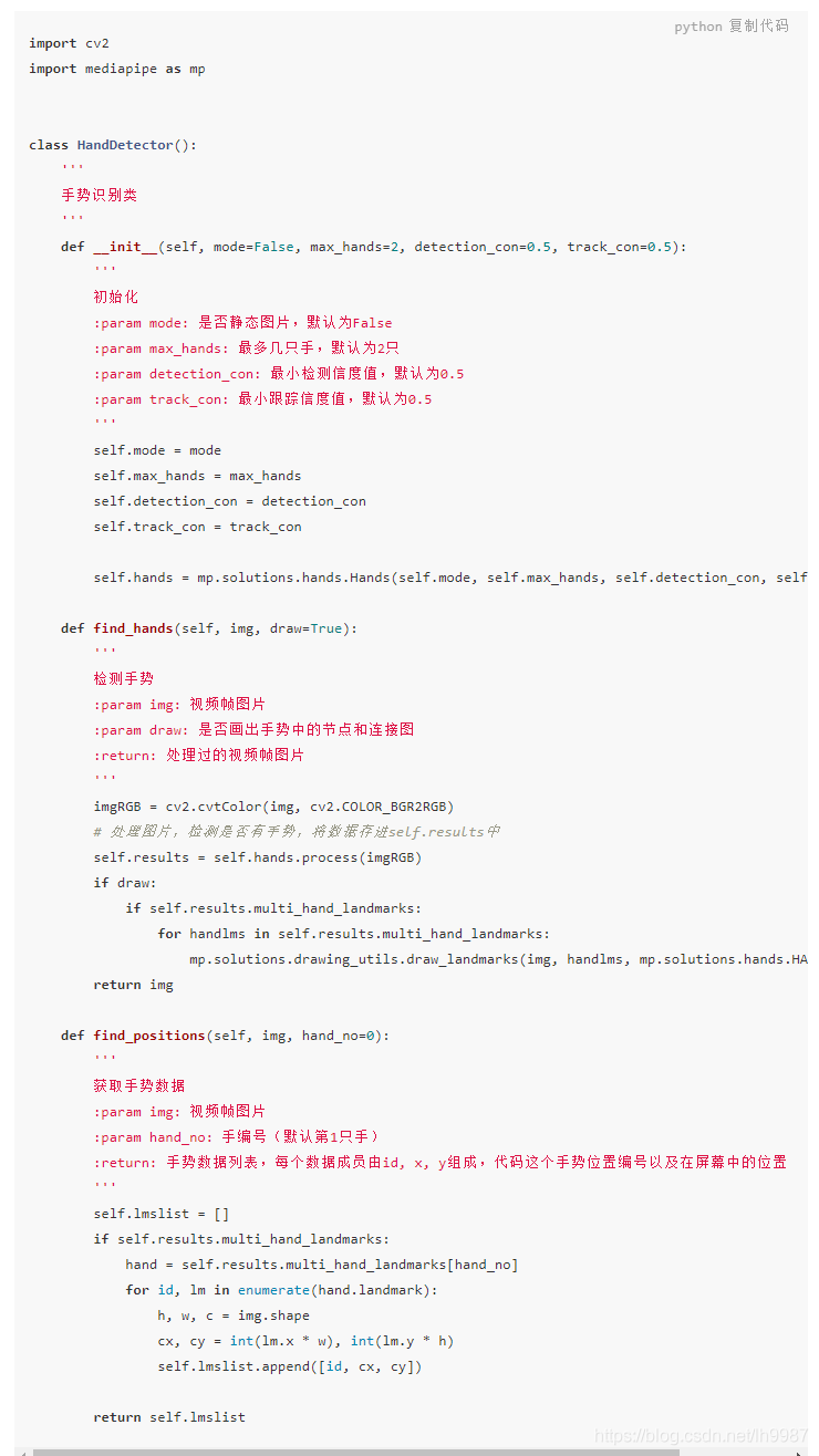 编写一个handutil.py模块,这个handutil模块有一个HandDetector类,提供了检测手势、获取手势数据的方法。代码如下,详细解释看代码注释: