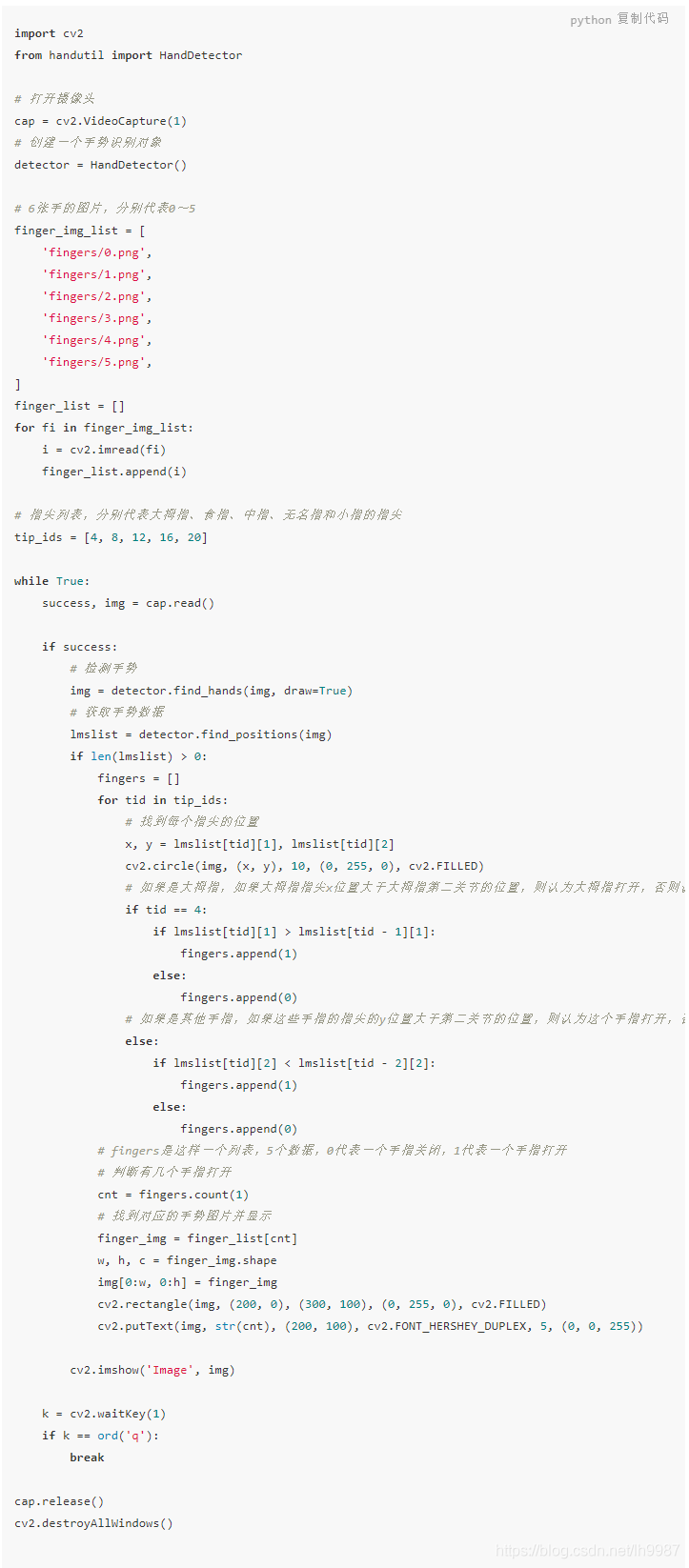 从上图可知:4, 8, 12, 16, 20分别代表大拇指、食指、中指、无名指和小指的指尖。完整代码如下: