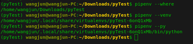 pipenv --where # 显示目录信息 pipenv --venv # 显示虚拟环境信息 pipenv --py # 显示Python解释器信息