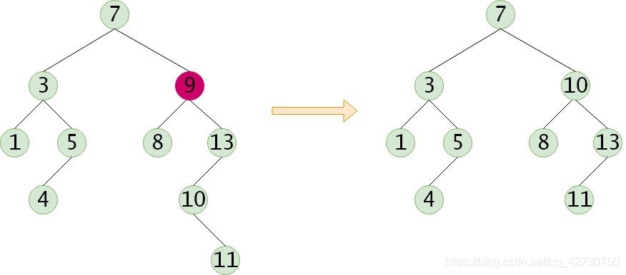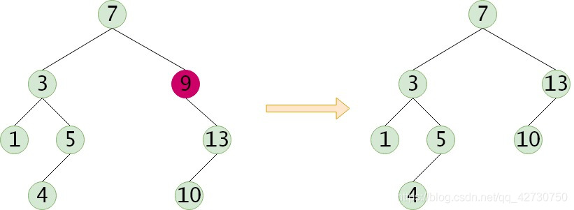 (2) 如果被删除的结点只有一棵左子树或右子树,需要让该结点的子树成为该结点的父结点的子树,以替代被删除结点的位置;