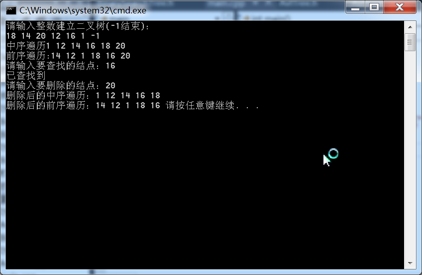 cout << "删除后的中序遍历:";