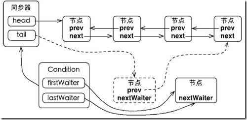 AQS的同步队列与Condition的等待队列,两个队列的作用是不同,事实上,每个线程也仅仅会同时存在以上两个队列中的一个,流程是这样的: