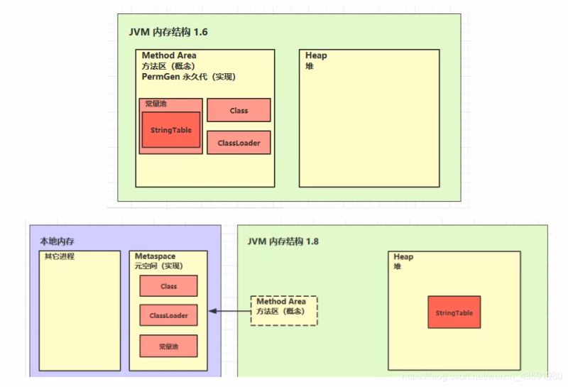 1.8 版本后,方法区交给本地内存管理,而脱离了JVM,由元空间实现(元空间不再使用堆的内存,而是使用本地内存,即操作系统的内存),由Class ClassLoader 常量池(StringTable 被移到了Heap 堆中管理) 组成。