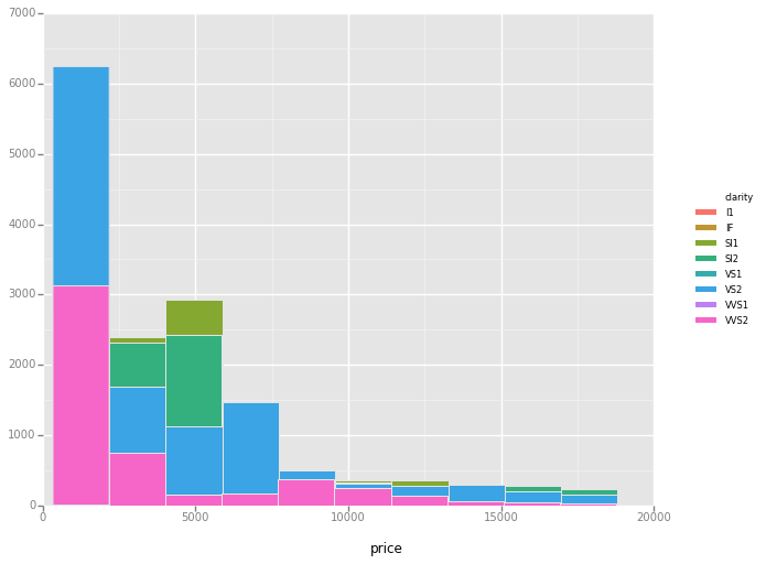 %matplotlib inline from ggplot import * ggplot(diamonds, aes(x='price', fill='clarity')) + geom_histogram()