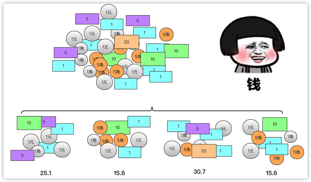 在学习分治算法之前,问你一个问题,相信大家小时候都有存钱罐的经历,父母亲人如果给钱都会往自己的宝藏中存钱,我们每隔一段时间都会清点清点钱。但是一堆钱让你处理起来你可能觉得很复杂,因为数据相对于大脑有点庞大了,并且很容易算错,你可能会将它先分成几个小份算,然后再叠加起来计算总和就获得这堆钱的总数了