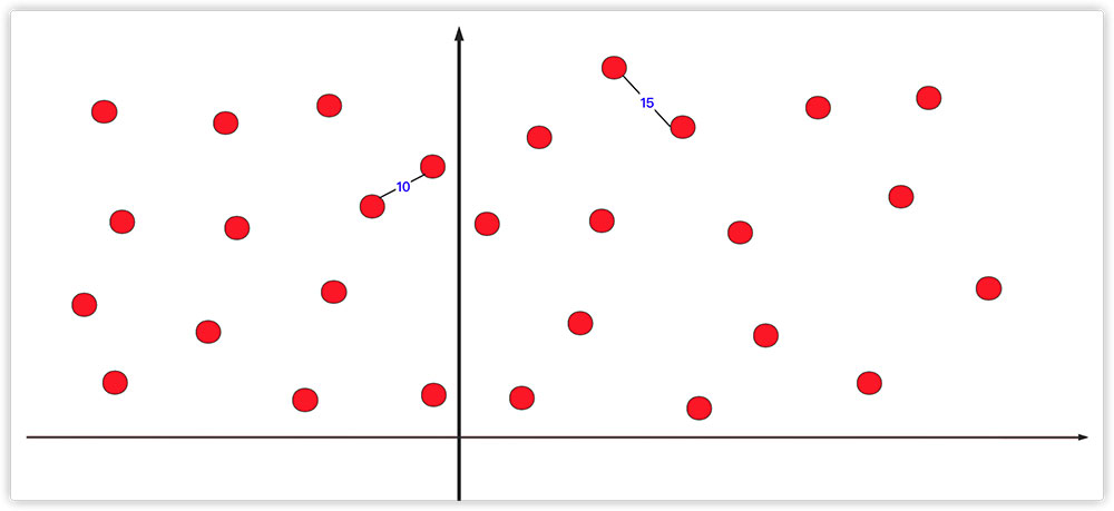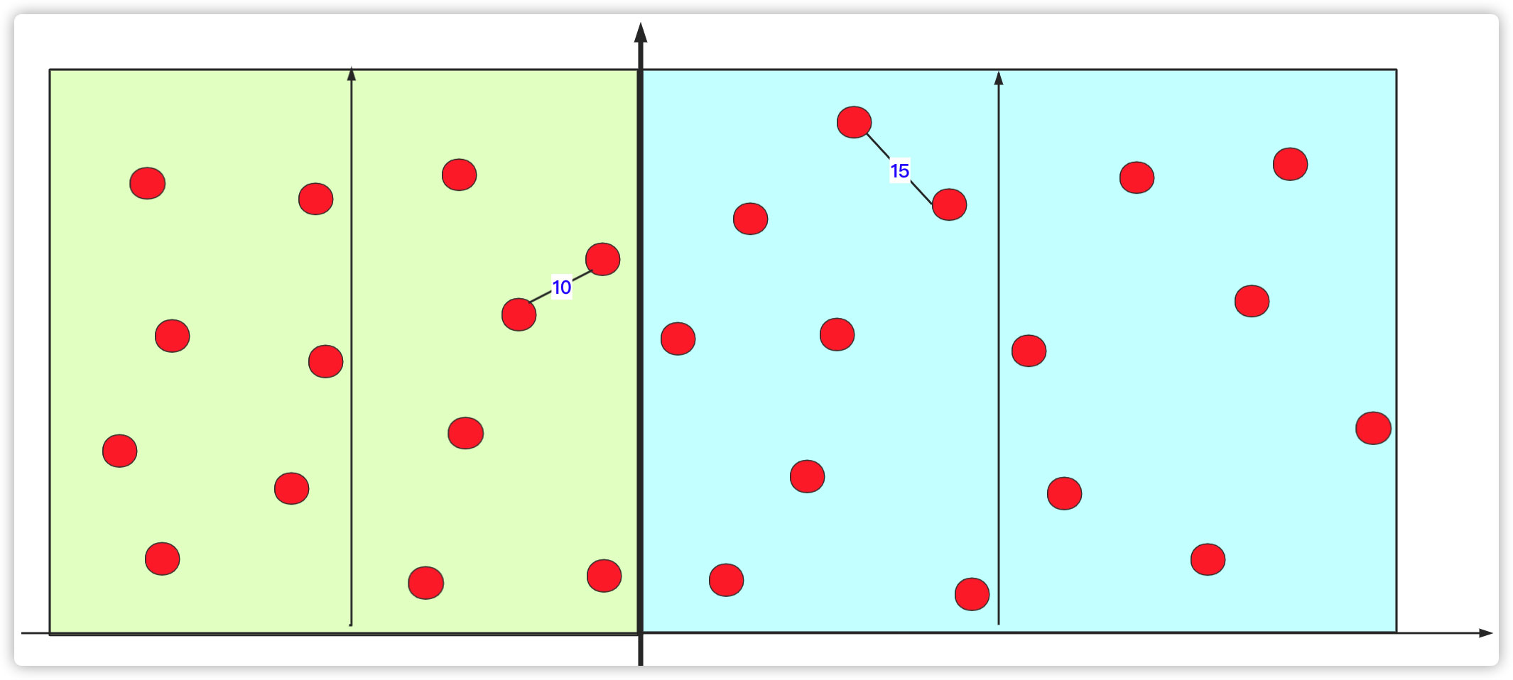 在具体的优化方案上,按照x或者y的维度进行考虑,将数据分成两个区域,先分别计算(按照同方法)左右区域内最短的点对。然后根据这个两个中较短的距离向左和向右覆盖,计算被覆盖的左右点之间的距离,找到最小那个距离与当前最短距离比较即可。