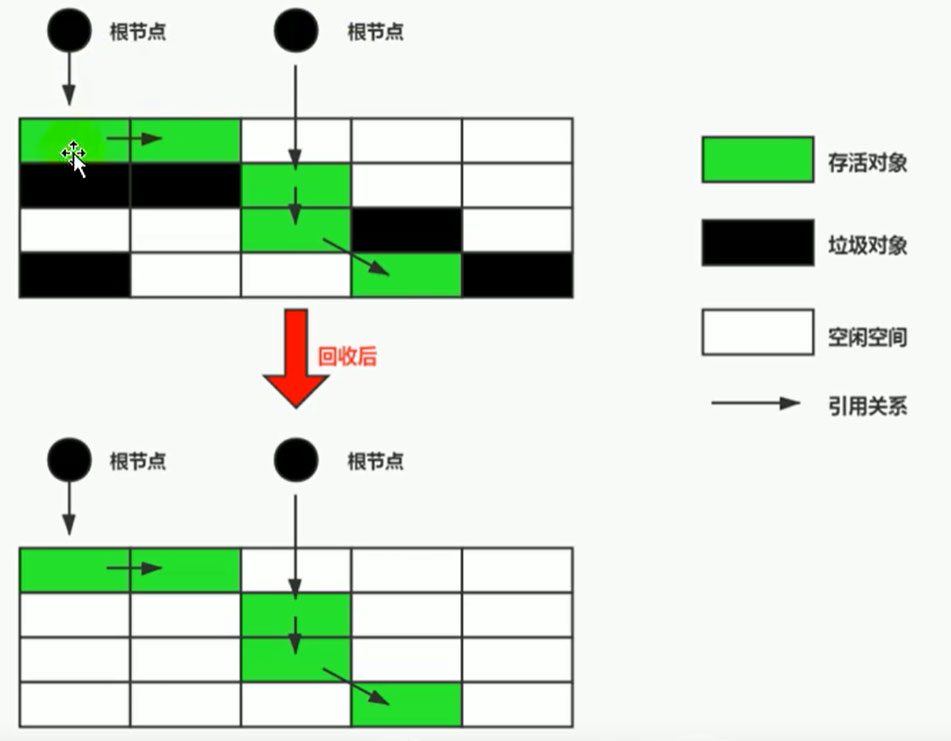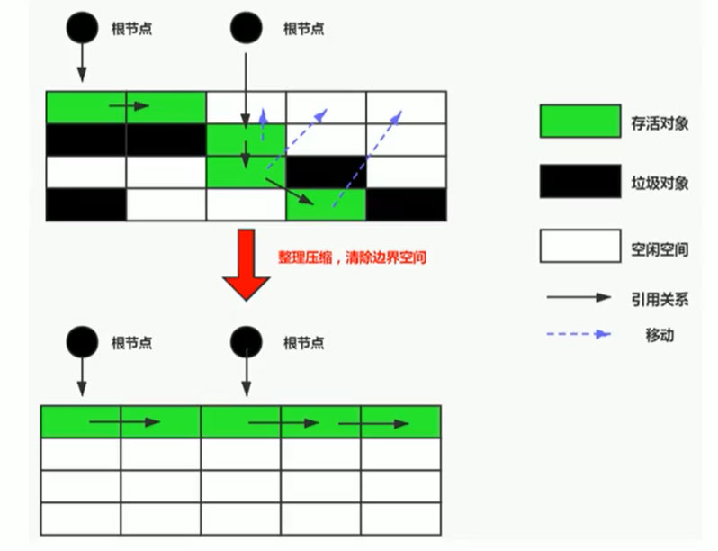 可以看到,标记的存活对象将会被整理,按照内存地址依次排列,而未被标记的内存会被清理掉。