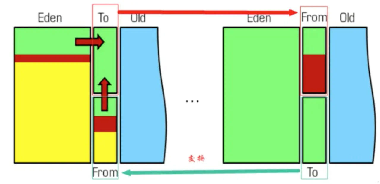 将活着的内存空间分为两块,每次只使用其中一块,在垃圾回收时将正在使用的内存中的存活对象复制到未被使用的内存块中,之后清除正在使用的内存块中的所有对象,交换两个内存的角色,最后完成垃圾回收。堆中S0和S1使用的就是复制算法。
