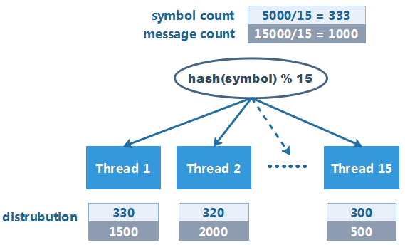 由于数据量巨大,系统中启动了 15 个线程来消费行情消息。消息分配的策略较为简单:对 symbol 的 hashCode 取模,将消息分配给其中一个线程进行处理。 经过验证,每个线程分配到的 symbol 数量较为均匀,于是系统愉快地上线了。
