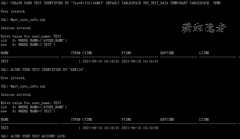 另外,我们来测试一下账号登录失败次数,在实验前先解锁账号,用错误的账号密码尝试登录数据库,你会发现LCOUNT就变成1了。