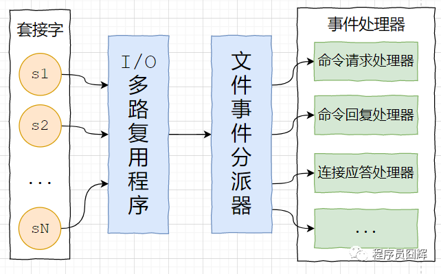 redis 基于 reactor 模式开发了自己的网络事件处理器,由4个部分组成:套接字、I/O 多路复用程序、文件事件分派器(dispatcher)、以及事件处理器。