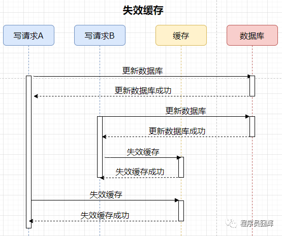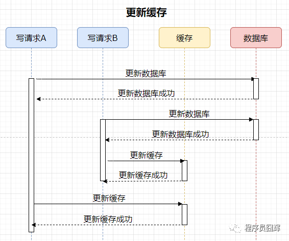 分析:数据库中的数据是请求B的,缓存中的数据是请求A的,数据库和缓存存在数据不一致。