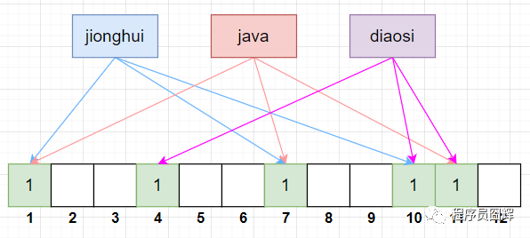 1)首先将“jionghui”跟3组 Hash 函数分别计算,得到 bitSet 的下标为:1、7、10。