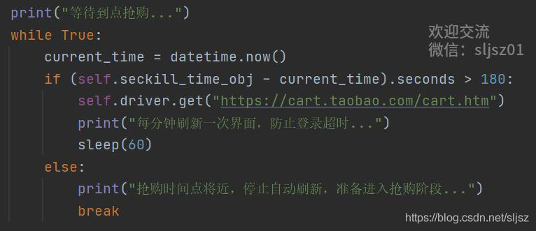 第二步,登陆后,我们仍然是通过chromedriver控制,进入购物车界面,并设定一个60秒的定时刷新,即每隔60秒刷新一遍购物车界面,使得我们的淘宝账户保持在登陆状态。直到当前的时间与我们所设定宝贝的抢购时间相差小于100秒,再进入下一步。