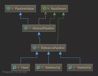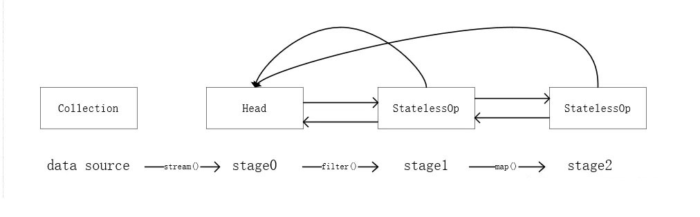从上面源码中可以看出来,我们调用stream()方法时最终会创建一个Head实例来表示流操作的头,当调用map()方法时则会创建无状态的中间操作实例StatelessOp,同样调用其他操作对应的方法也会生成一个ReferencePipeline实例,在这里就不一一列举。在用户调用一系列操作后,最终会形成一个双向链表,如下图所示: