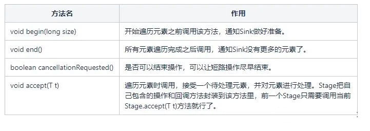 上面我们说明了Stream是通过stage记录操作,但stage只保存当前操作,它并不知道下个stage如何操作,需要什么操作。所以要执行的话还需要某种协议将各个stage关联起来。jdk中就是使用Slink接口来实现的,Slink接口定义begin()、end()、cancellationRequested()、accept()四个方法,如下表所示。