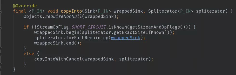 上述代码首先调用wrappedSink.begin()方法告诉Sink数据即将到来,然后调用spliterator.forEachRemaining()方法对数据进行迭代,最后调用wrappedSink.end()方法通知Sink数据处理结束。逻辑如此清晰。