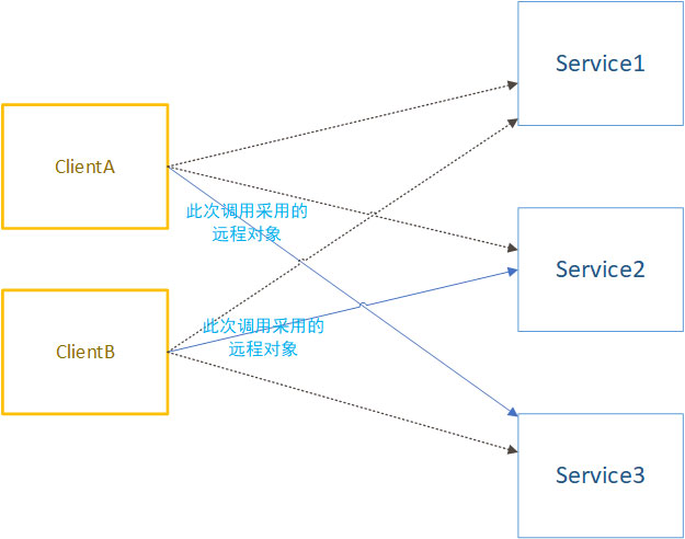 如图下图所示,ClientA某个时刻的一次调用使用了Service3节点进行远程服务调用,而ClientB某个时刻的一次调用采用Service2节点。Tars Java提供多种负载均衡算法实现类,其中有采用RR轮训算法的RoundRobinLoadBalance,一致性哈希算法的ConsistentHashLoadBalance和普通哈希算法的HashLoadBalance。