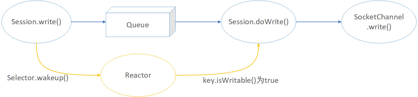 具体Reactor逻辑见上文2.5 网络模型内容,如果Reactor检查条件发现可以写IO的话也就是key.isWritable()为true,那么最终会循环从TCPSession.queue中取出ByteBuffer对象,调用SocketChannel.write(byteBuffer)执行实际的写网络Socket操作,代码逻辑见源码中的doWrite()方法。