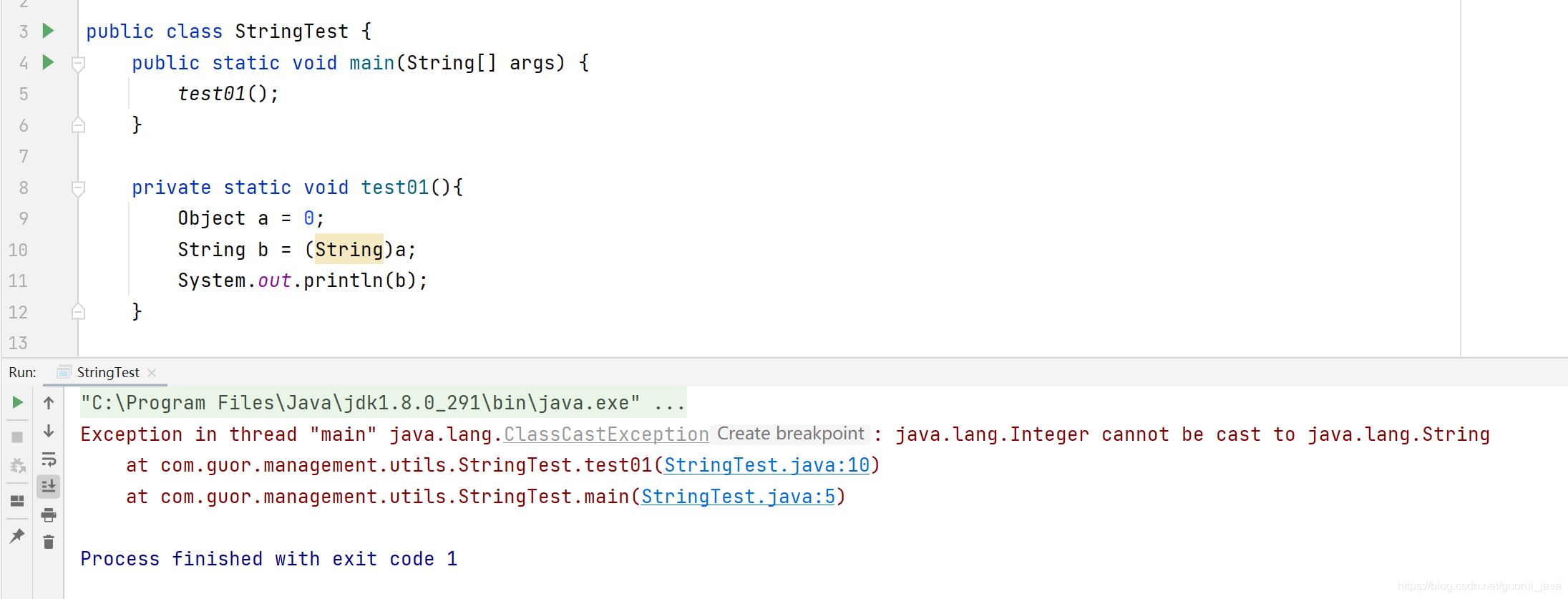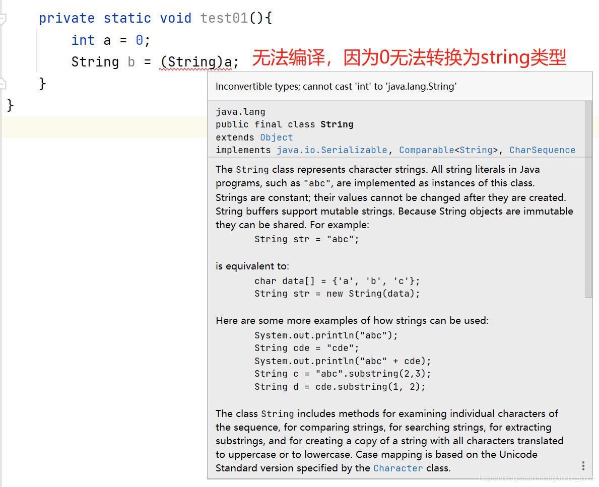 (String)是标准的类型转换,将Object类型转为String类型,使用(String)强转时,最好使用instanceof做一个类型检查,以判断是否可以进行强转,否则容易抛出ClassCastException异常。需要注意的是编写的时候,编译器并不会提示有语法错误,所以这个方法要谨慎的使用。