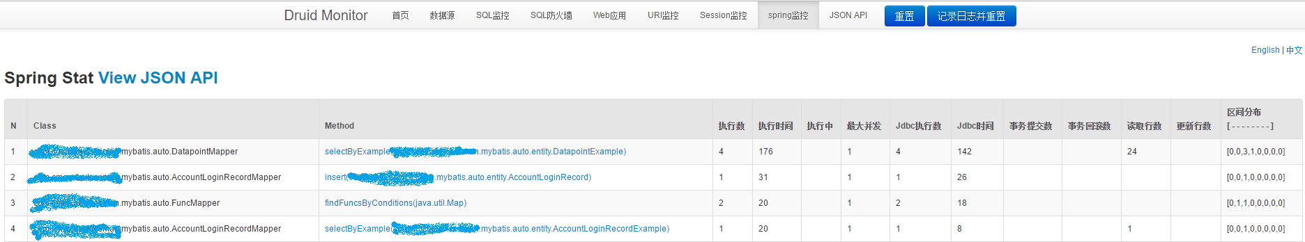 在Spring监控页,可以显示相关DAO执行的方法,方法执行的次数、执行的时间等信息。
