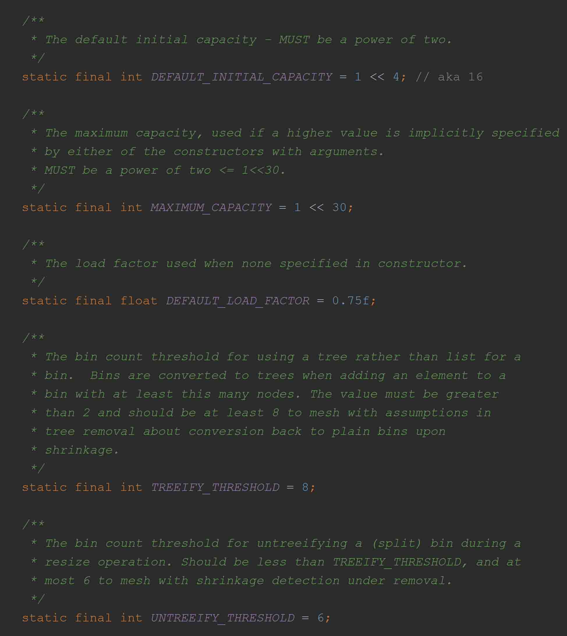 TREEIFY_THRESHOLD:链表转化为红黑树的阈值(包含)