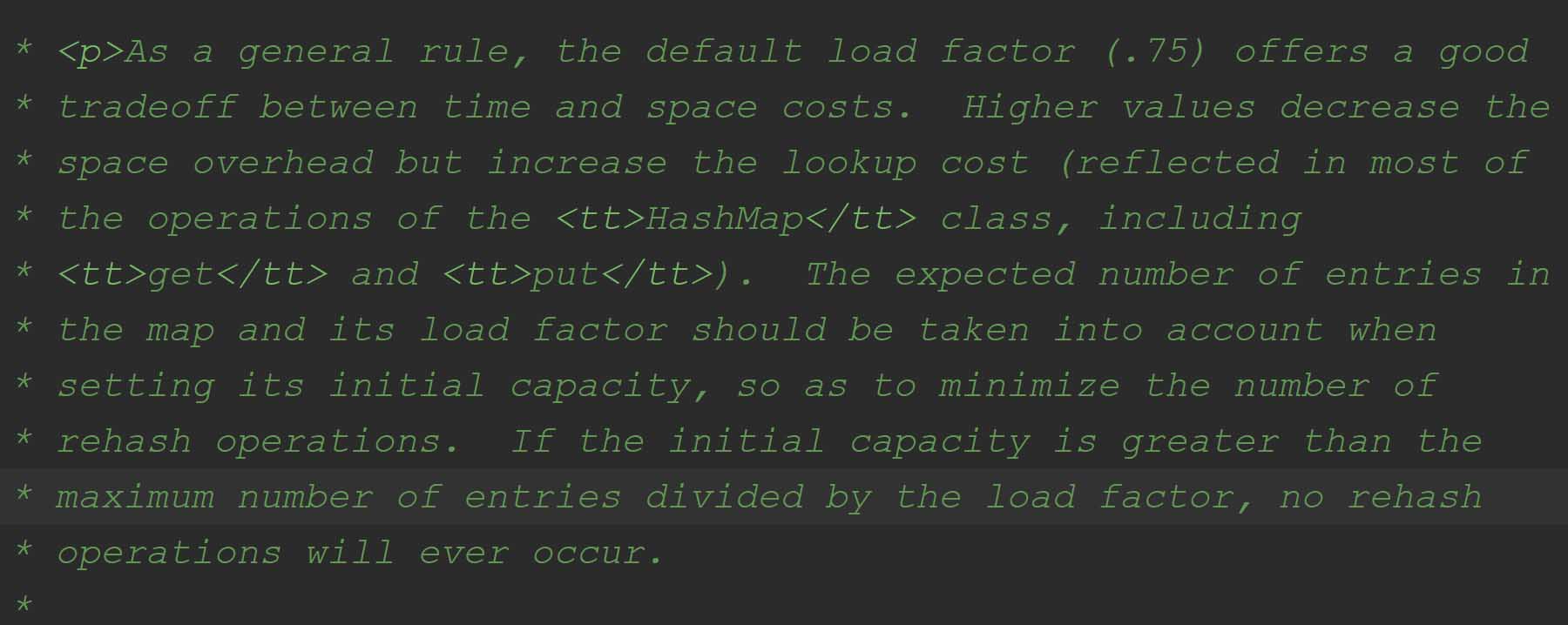 在HashMap的类注释上有如图一段解释:大致意思是说负载因子是0.75的时候,空间利用率比较高,而且避免了相当多的Hash冲突,使得底层的链表或者是红黑树的高度比较低,提升了空间效率。