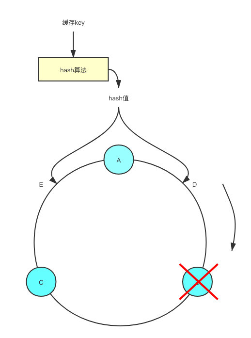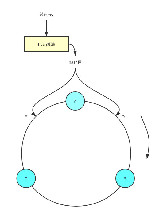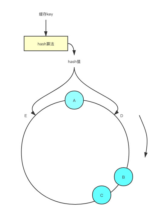 假设我们有A、B、C三个Redis实例按照如图所示的位置分布在圆环上,此时计算出来的hash值,取模之后位置落在了位置D,那么我们按照顺时针的顺序,就能够找到我们这个key应该分配的Redis实例B。同理如果我们计算出来位置在E,那么对应选择的Redis的实例就是A。