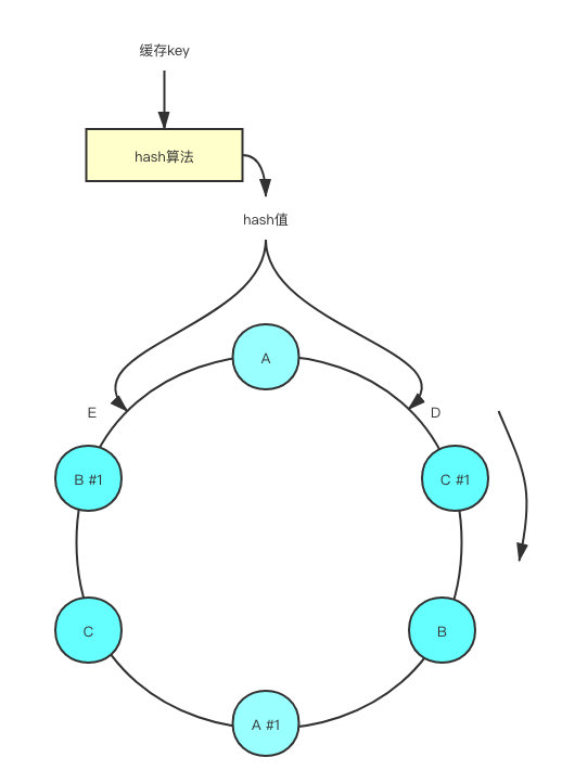 在圆环中,增加了对应节点的虚拟节点,然后完成了虚拟节点到真实节点的映射。假设现在计算得出了位置D,那么按照顺时针的顺序,我们找到的第一个节点就是C #1,最终数据实际还是会落在节点C上。