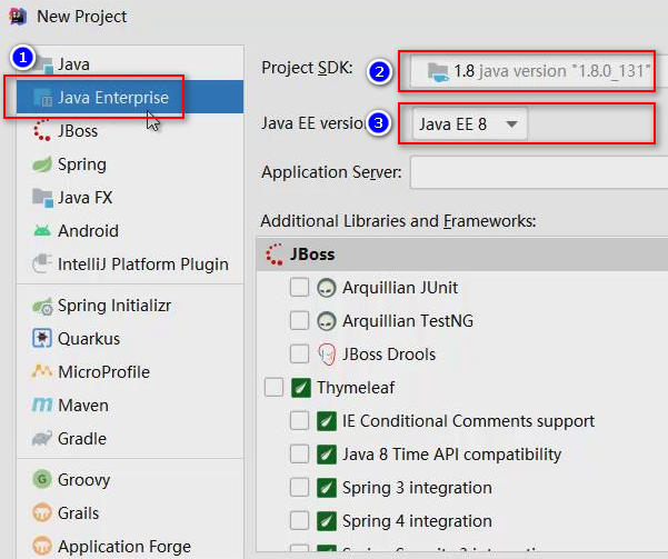 在New Project对话框的左侧选择Java Enterprice,在右侧确保Project SDK是1.8版本,Java EE version为Java EE 8(也可以是略低的其它版本):
