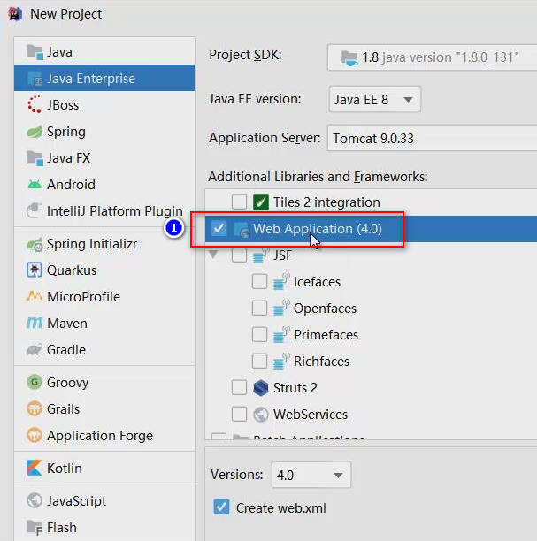 回到New Project对话框,在Additional Libraries and Frameworks的列表中,勾选Web Application (4.0),然后点击Next到下一步: