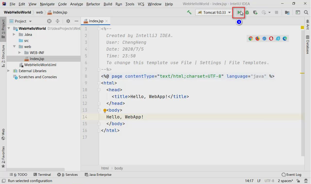 点击窗口右上角的“运行”按钮,即可将当前项目部署到Tomcat并运行: