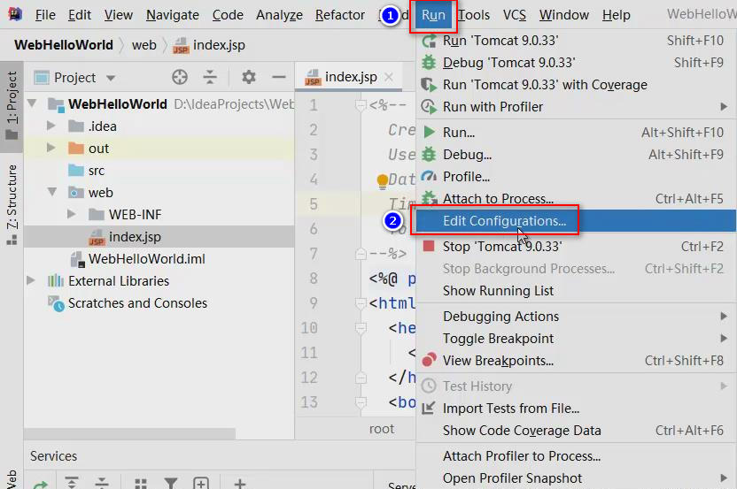 刚才启动项目时,会自动打开浏览器并访问项目的页面,是项目的启动设置中的配置决定的,点击IntelliJ IDEA的Run菜单的Edit Configurations即可打开启动设置: