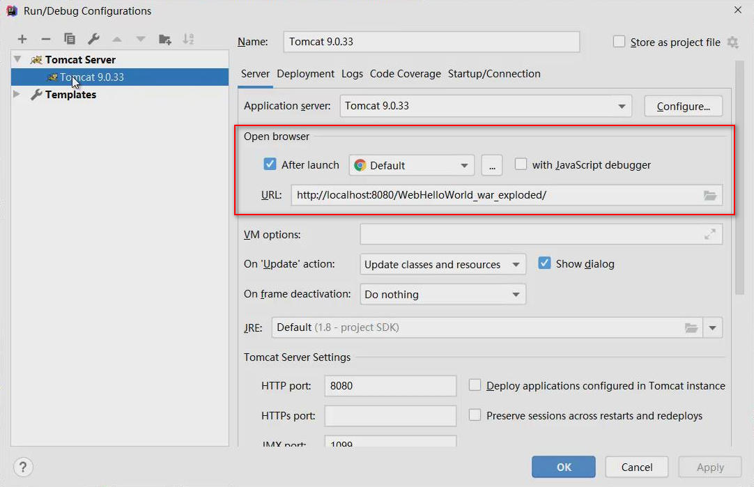在设置面板中,有Open Browser(打开浏览器)设置项,在下方默认勾选了After launch(启动之后)、所使用的浏览器,及打开浏览器后访问的URL:
