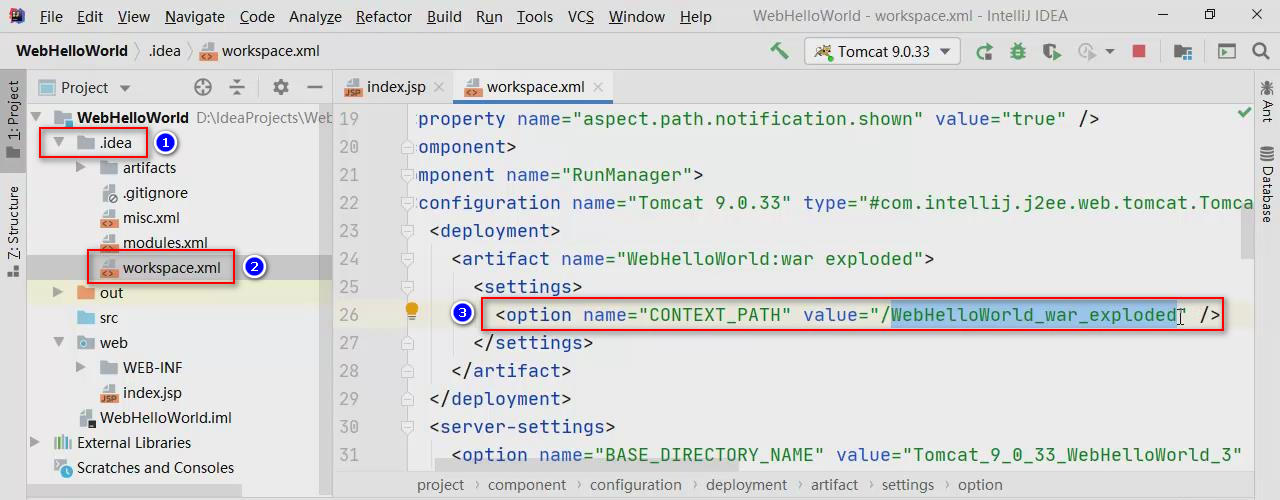 如果需要修改项目的Context Path,展开项目结构中的.idea,打开workspace.xml文件,在该文件的第26行(因版本差异可能行号不同)就是Context Path值的配置: