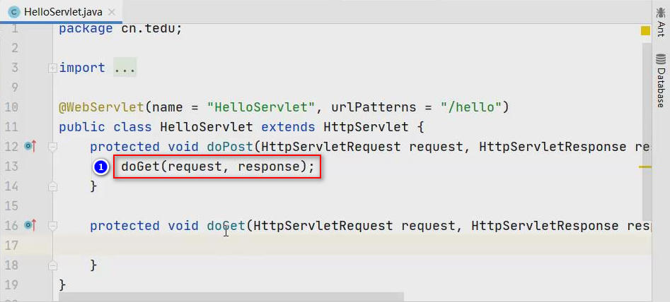 默认情况下,当前Servlet中已经生成了重写的doPostdoGet方法,由于本次只是简单的访问即可,客户端提交请求的方式应该是GET类型,则不需要doPost方法,删掉即可,如果允许使用POST方式访问,且与GET方式相同的处理模式,则在doPost方法中直接调用doGet方法即可: