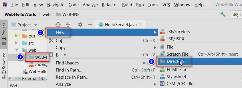 在实现转发时,需要一个JSP页面文件,通常,会将JSP文件保存到WEB-INF的某个子级文件夹中,避免JSP文件被直接访问!对WEB-INF文件夹点击鼠标右键,依次选择New > Directory以创建用于存放JSP文件的文件夹: