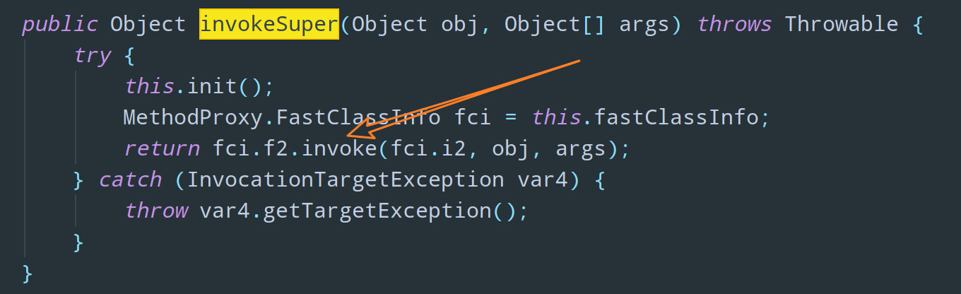 • MethodProxy var4:用于调用委托类的原始方法(底层也是通过反射机制,不过不是 Method.invoke 了,而是使用 MethodProxy.invokeSuper 方法)