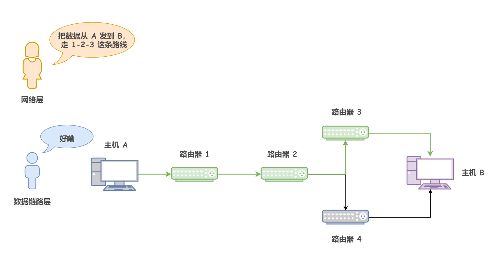 比如上图,网络层告知了 1-2-3 路线,也就是说指明了这几个路由器的 IP 地址。那么数据链路层就会根据这几个 IP 地址对应的 MAC 地址依次找到 1、2、3,并在他们之间传输数据。