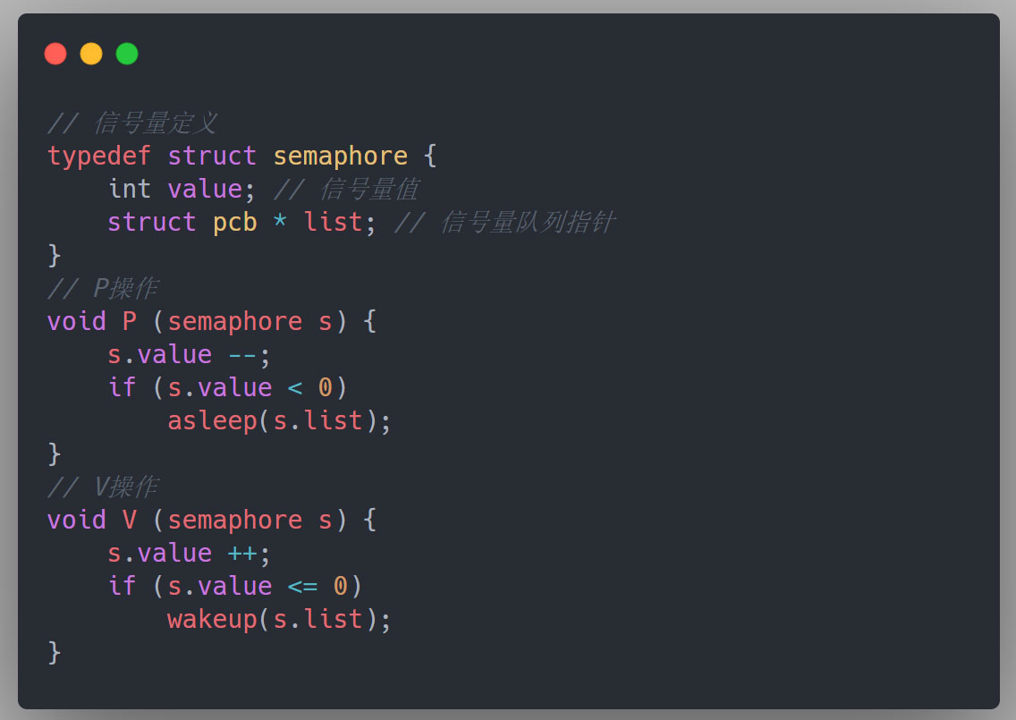 可以这么理解,当信号量的值为 2 的时候,表示有 2 个资源可以使用,当信号量的值为 -2 的时候,表示有两个进程正在等待使用这个资源。不看这句话真的无法理解 V 操作,看完顿时如梦初醒。