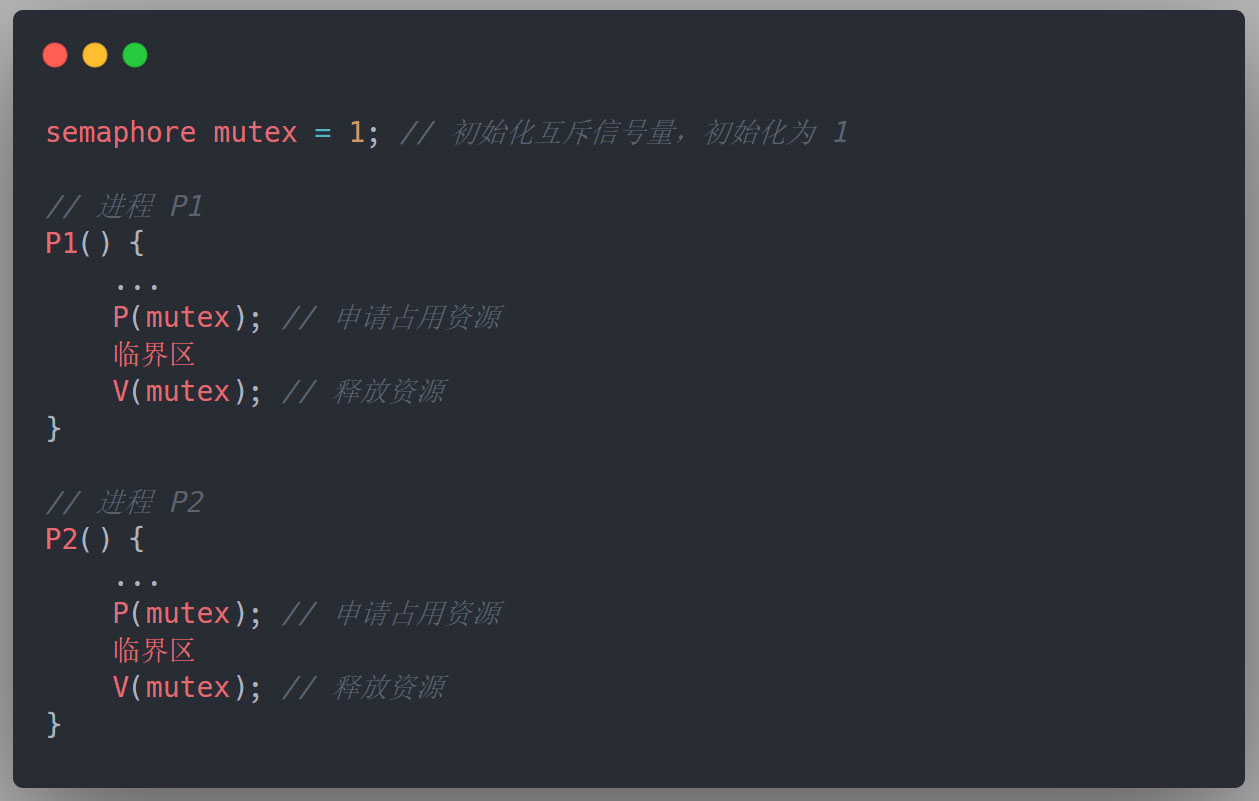 • 把对于临界资源的访问置于 P 操作和 V 操作之间