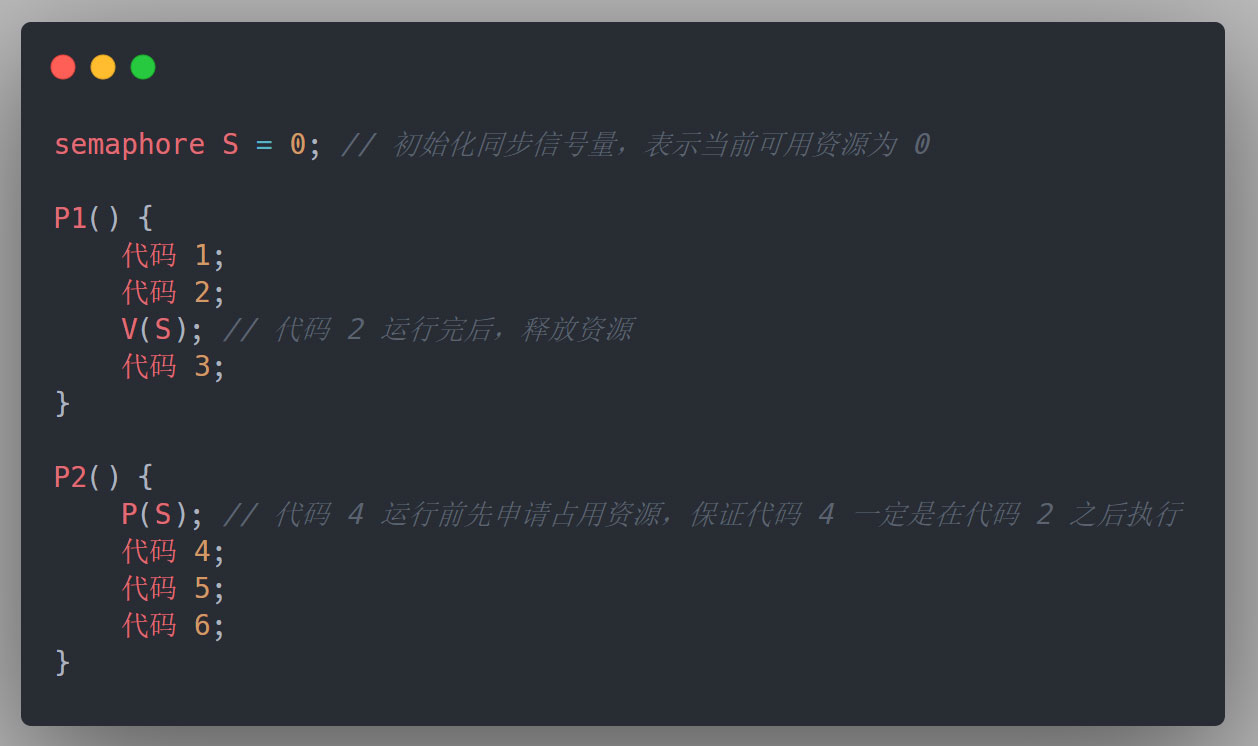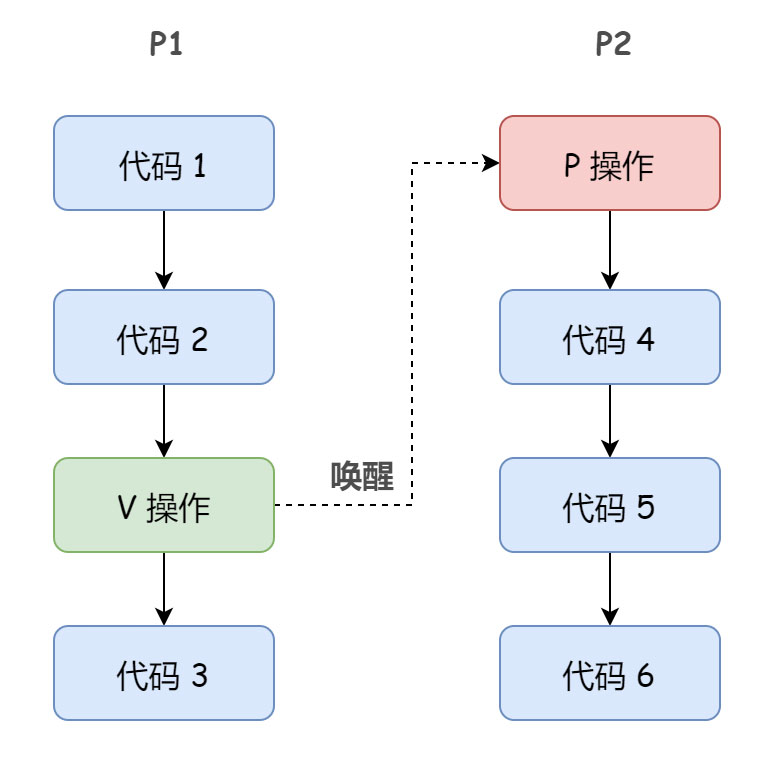 如果 P2 的 “代码4” 要基于 P1 的 “代码1” 和 “代码2” 的运行结果才能执行,那么我们就必须保证 “代码4” 一定是在 “代码2” 之后才会执行。
