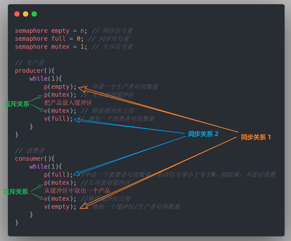 由题可知,生产者、消费者共享一个初始为空、大小为 n 的缓冲区,我们从题目中提炼出同步与互斥关系: