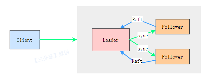 Nacos采用的一个Leader节点,多个Follower节点的集群架构,数据一致性算法采用的是Raft。
